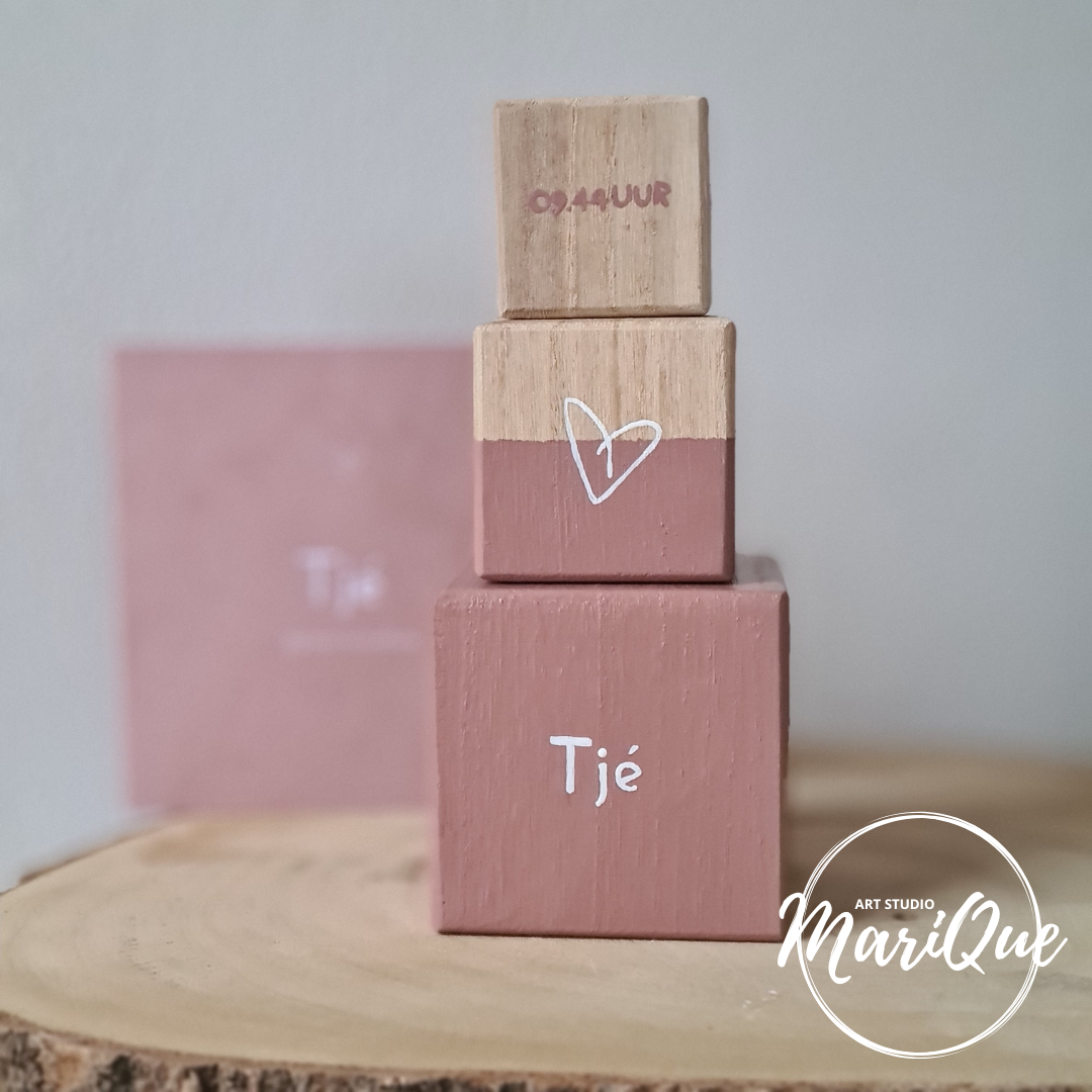 Deze blokkentoren bestaande uit 3 blokken met afgeronde hoeken van 5, 6 en 8 cm. Gepersonaliseerd met: