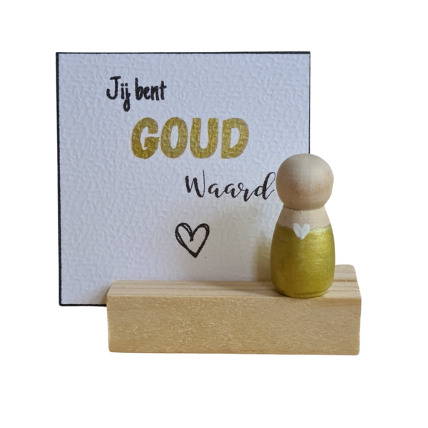 Laat iemand weten hoe waardevol ze zijn met dit warme Cadoosje: een houten kaarthouder, een kaartje met de tekst “Jij bent goud waard” en een pegdoll. Ideaal om iemand een hart onder de riem te steken. Kies je kleur en personaliseer het helemaal naar wens.