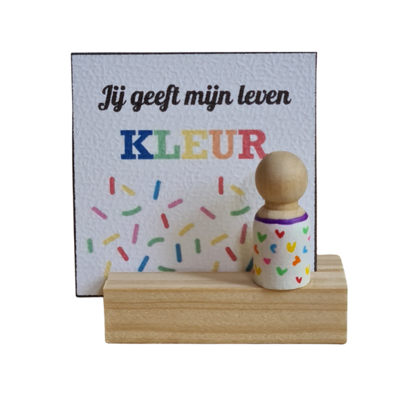Laat iemand weten hoe bijzonder ze zijn met dit kleurrijke Cadoosje: een houten kaarthouder, een kaartje met de tekst “Jij geeft mijn leven kleur” en een pegdoll. Een stralend cadeau dat je zelf kunt samenstellen: kies de vorm pegdoll of maak een eigen tekst.