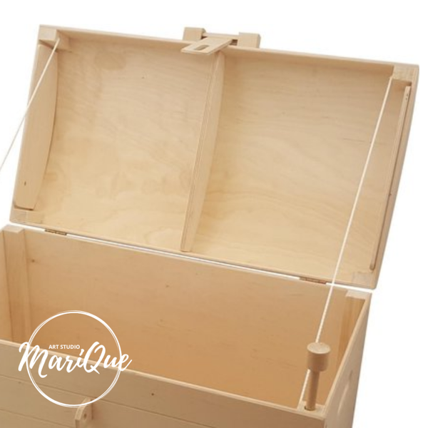 Dankzij de slimme houten sluitpin kun je de deksel veilig openhouden zonder dat vingers bekneld raken. Zo is de kist niet alleen mooi, maar ook kindvriendelijk.