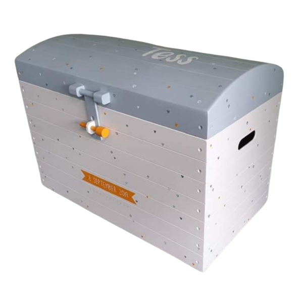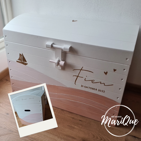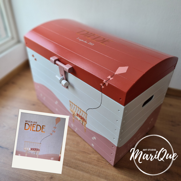 Deze stevige en ruime opbergkist van berkenhout is de perfecte plek om speelgoed én waardevolle herinneringen te bewaren. Deze kisten zijn met liefde en vakmanschap gemaakt en kunnen gepersonaliseerd worden met een naam, afbeelding en tekst naar keuze, bijvoorbeeld op basis van een geboortekaartje, trouwkaart of rouwkaart.